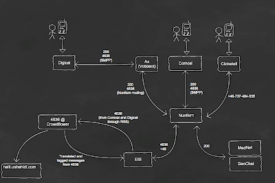 - 4636.ushahidi.com: ad-hoc development from Ushahidi to curate incoming messages. Soon to be moved to crowdflower.com